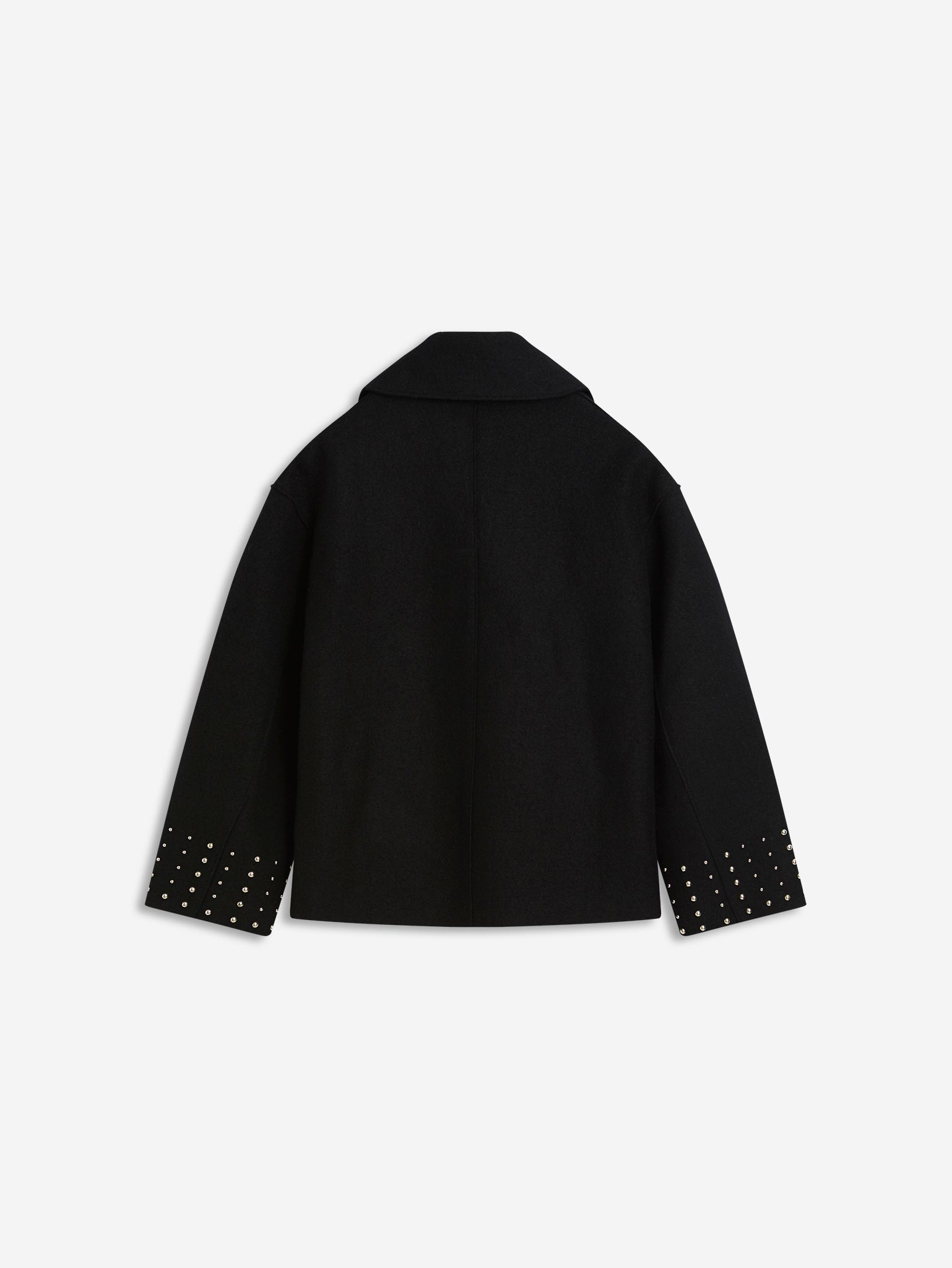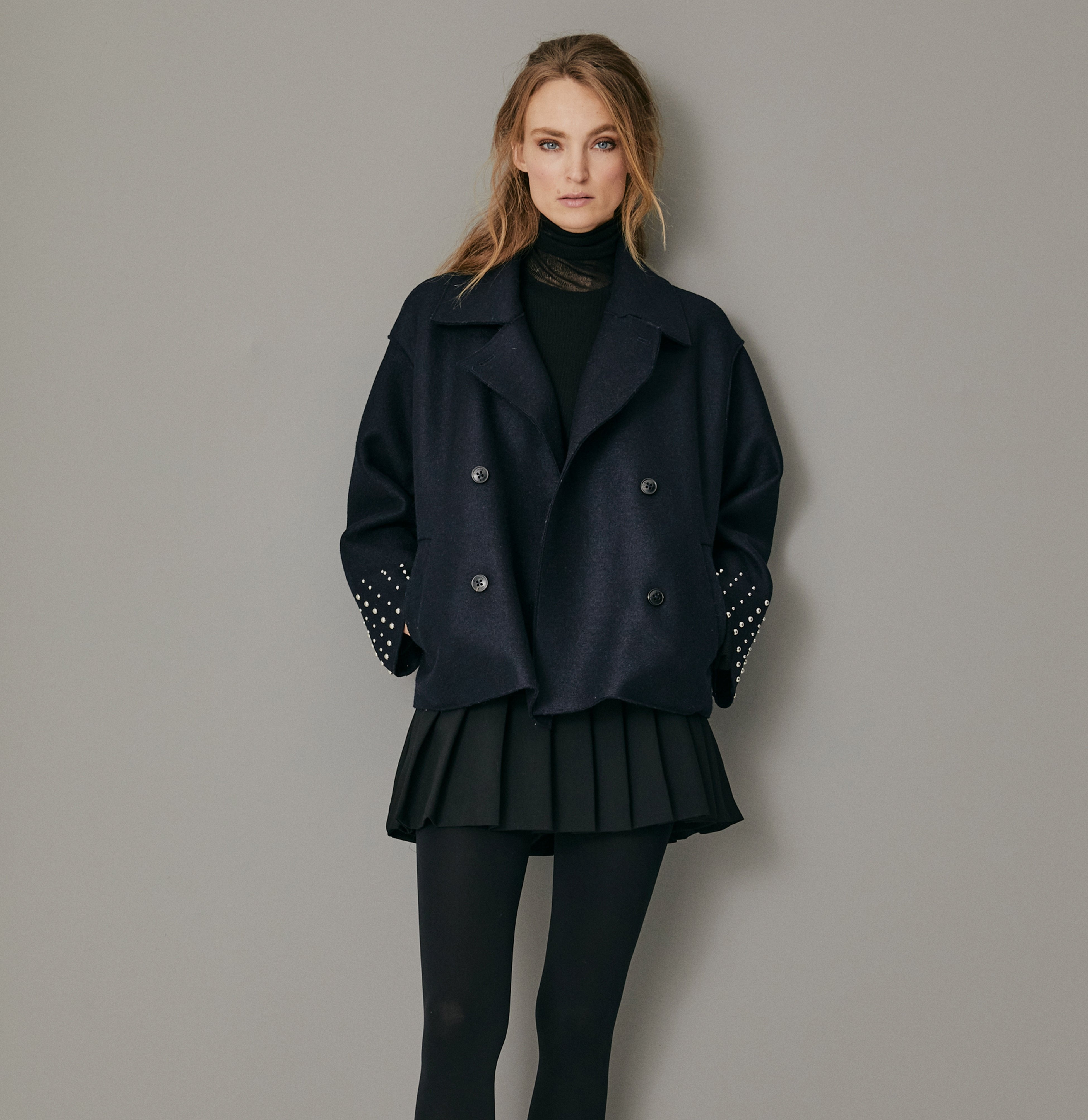 Doppelreihig und natürlich aus Wollwalk hat sie alles, was den Klassiker ausmacht. Der große Reverskragen lässt sich mit verdeckten Knöpfen bis oben schließen. Und den modernen Twist bringt die leicht ausgestellte Oversized Form mit überschnittenen Schultern und natürlich die silbernen, halbkugelförmigen Nieten, die sich wie ein Schmuckstück um die Handgelenke ziehen.