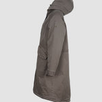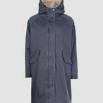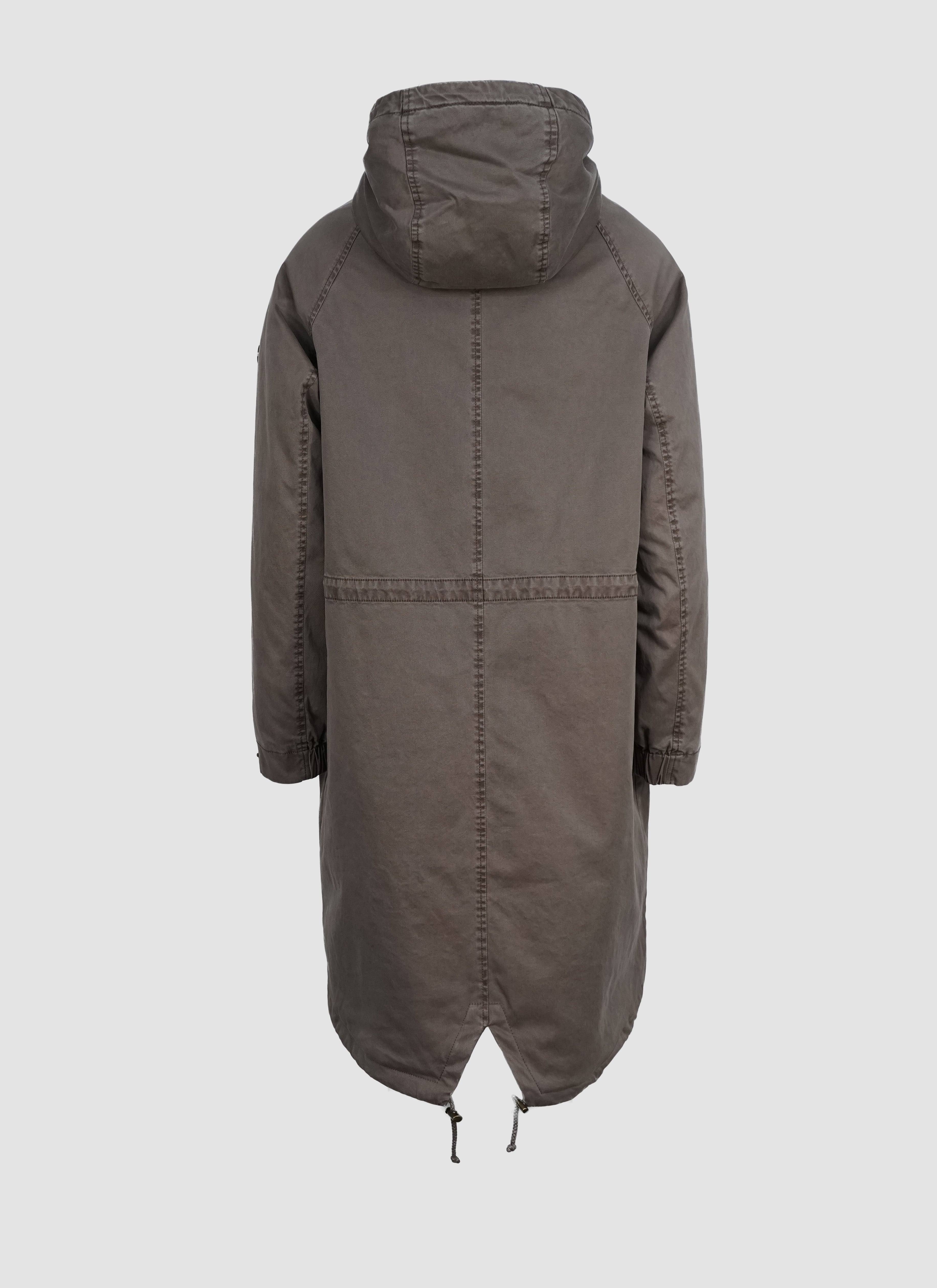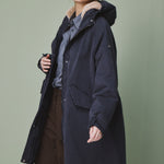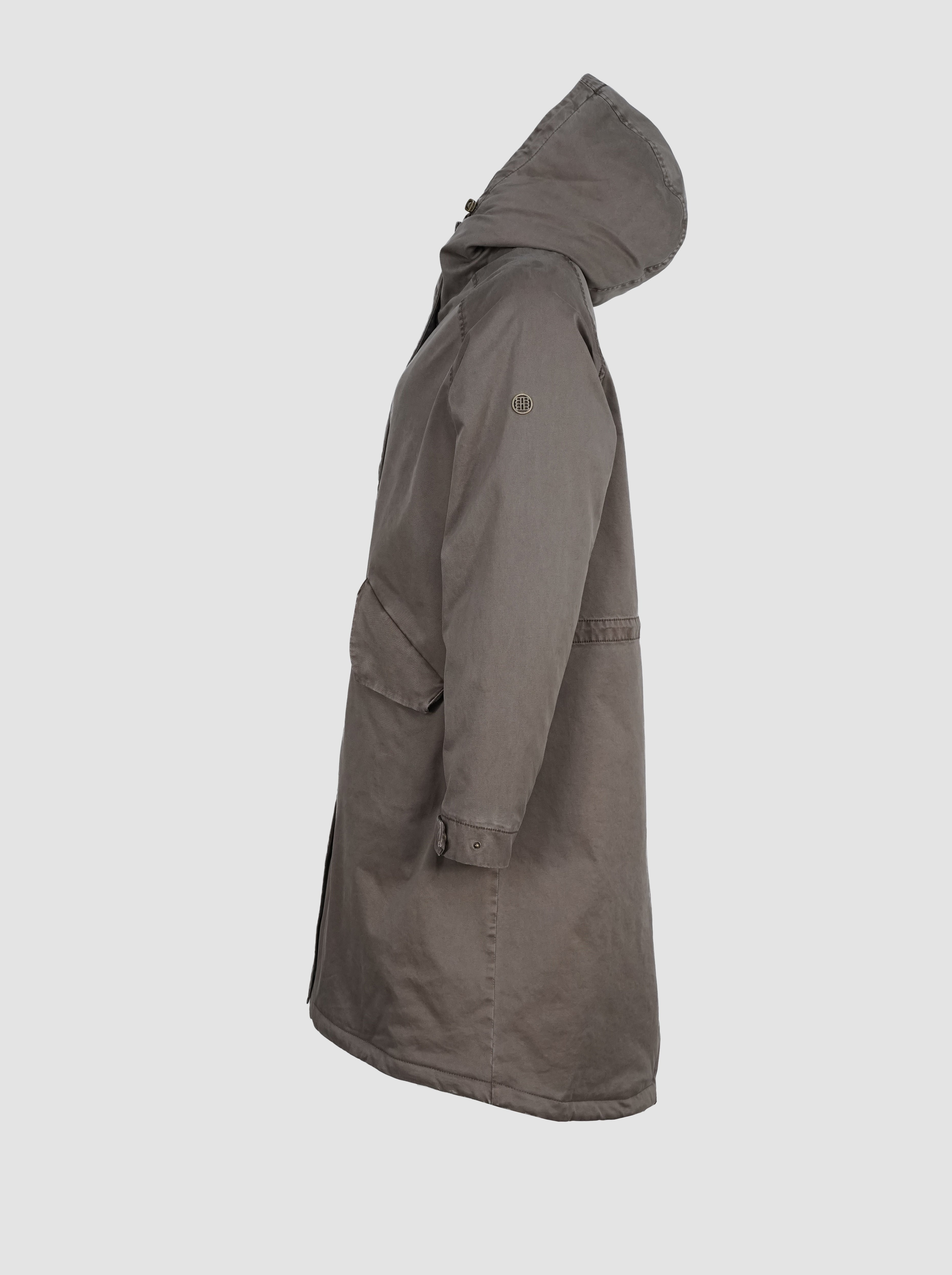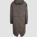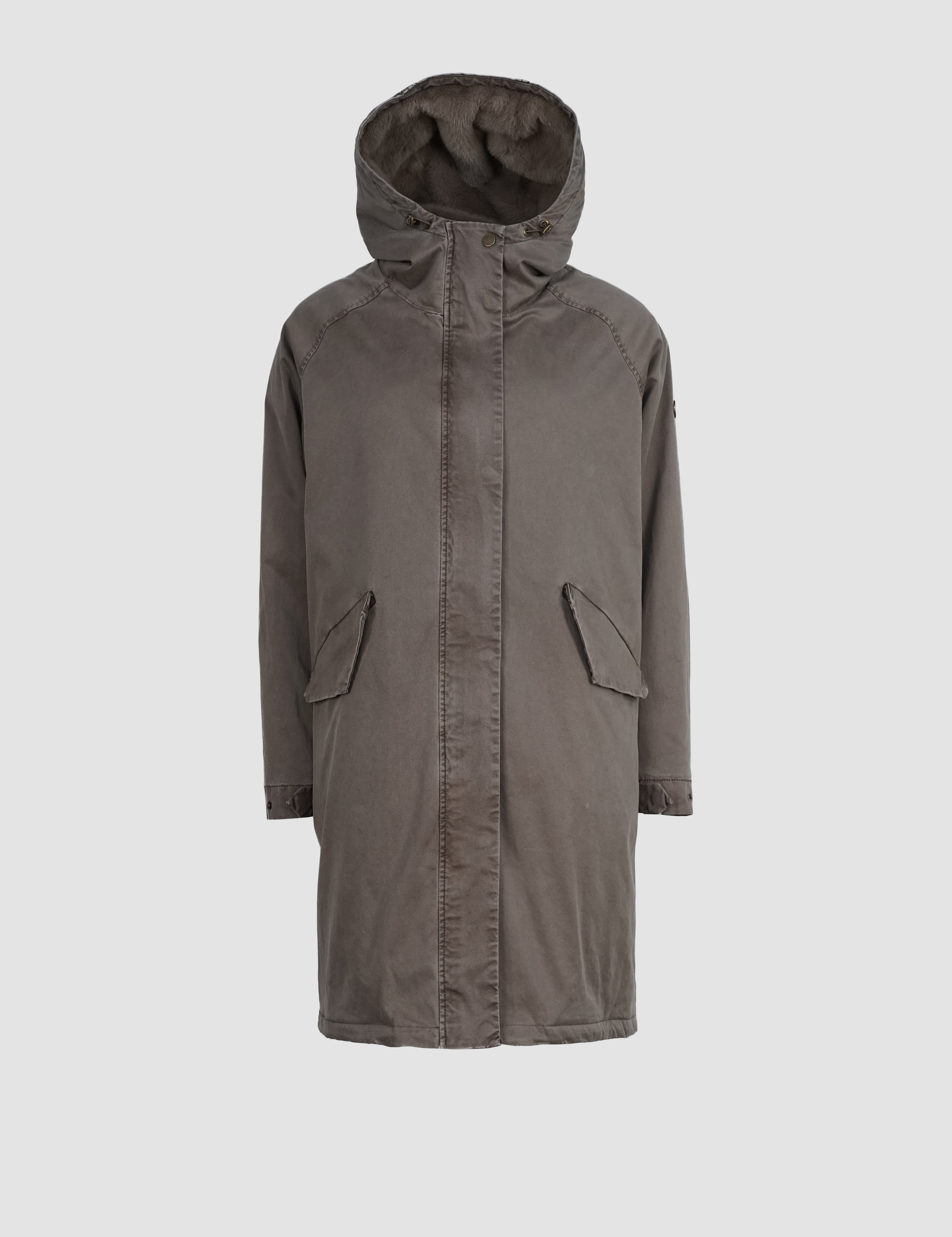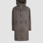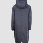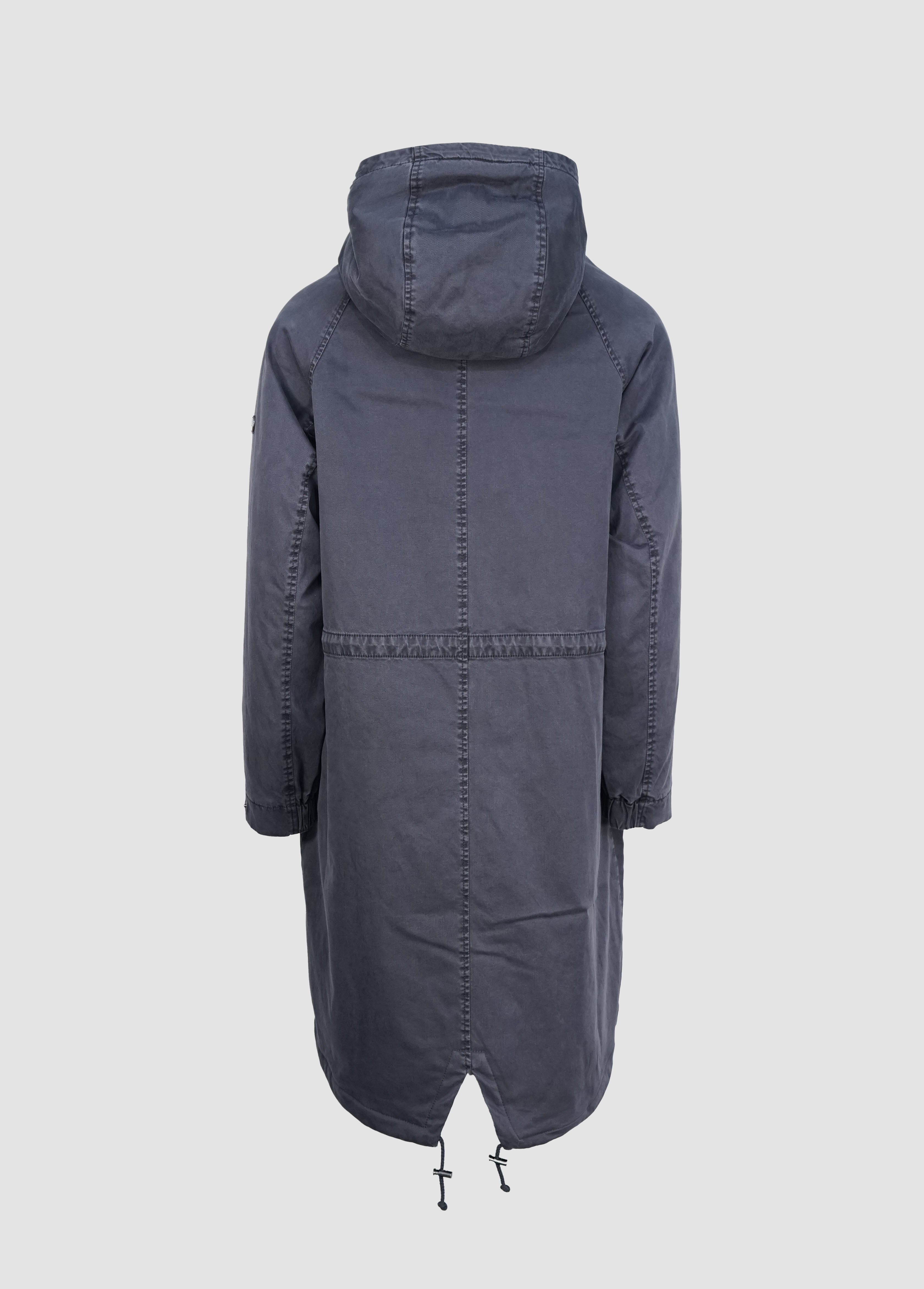 Die lange Form sorgt für zuverlässigen Schutz, während die verdeckte Knopfleiste mit Zwei-Wege-Reißverschluss für eine cleane Optik steht. Eine großzügig geschnittene Kapuze, die weich gefüttert ist, rundet den Look ab und schützt zusätzlich bei Wind und Wetter.