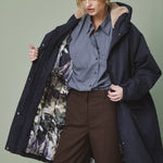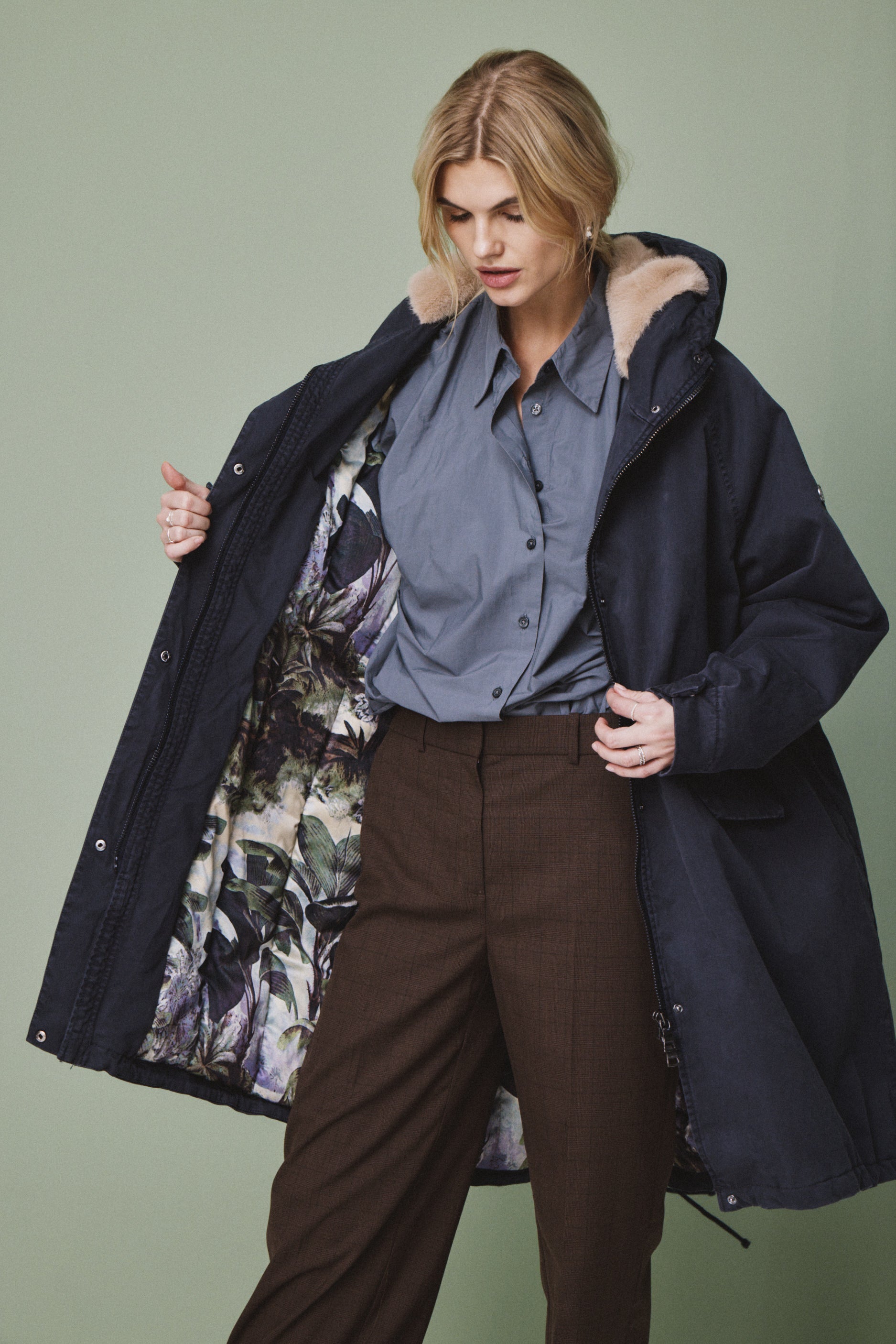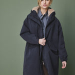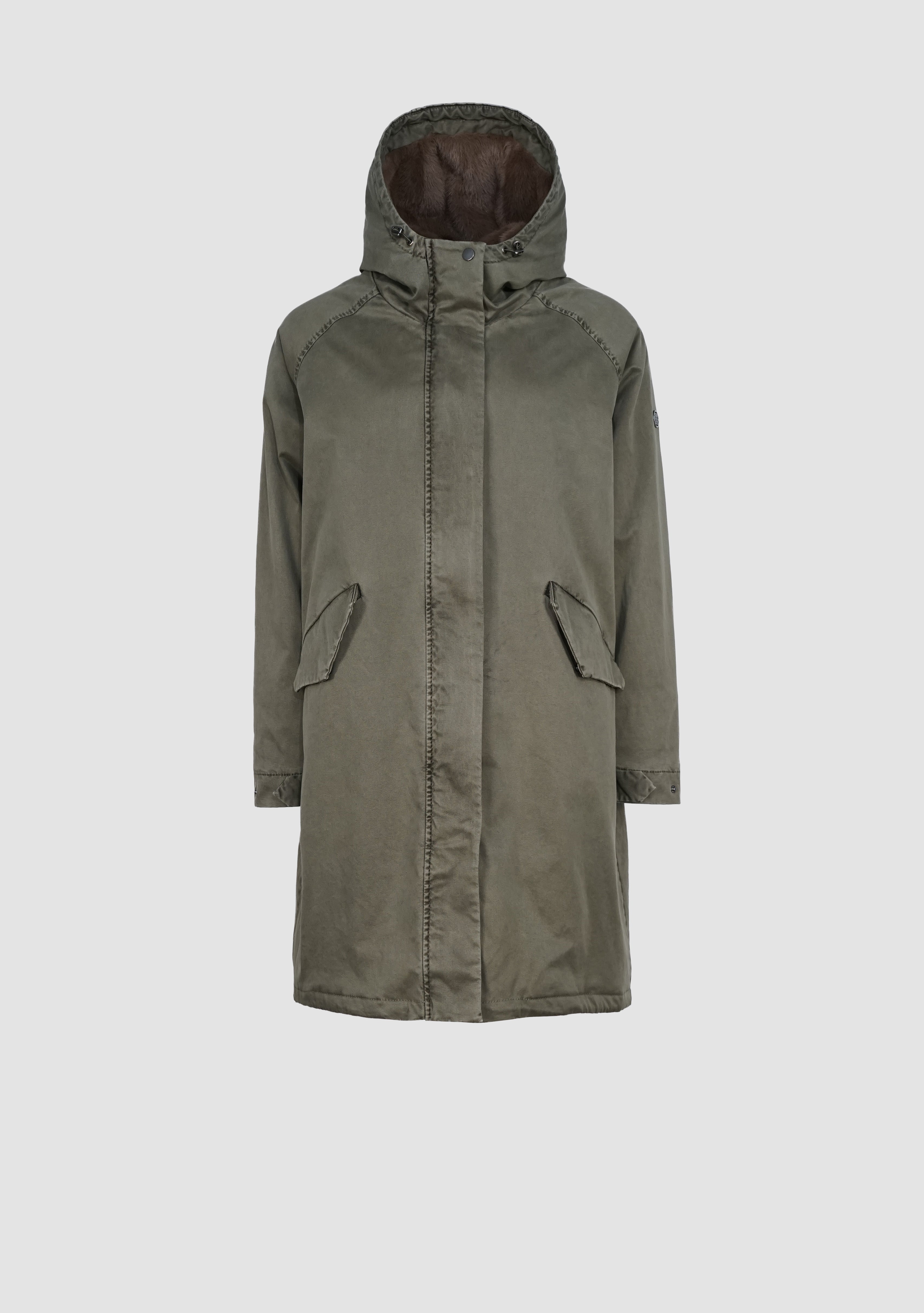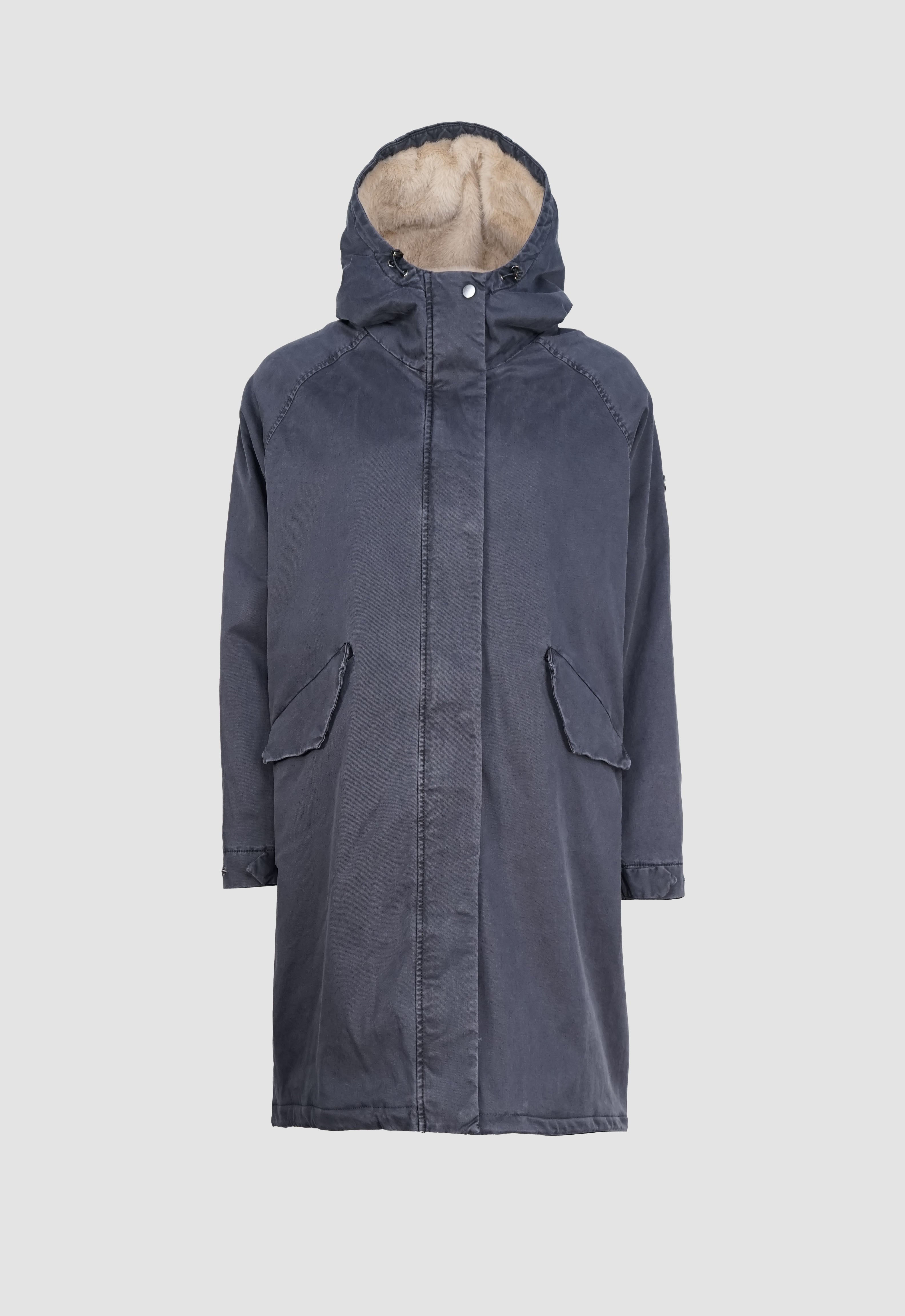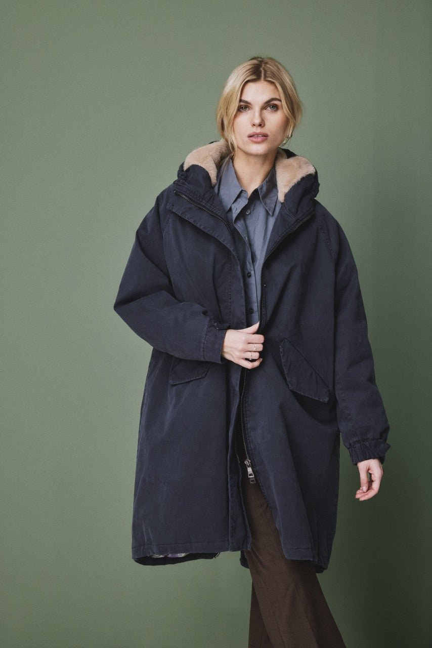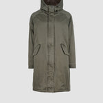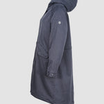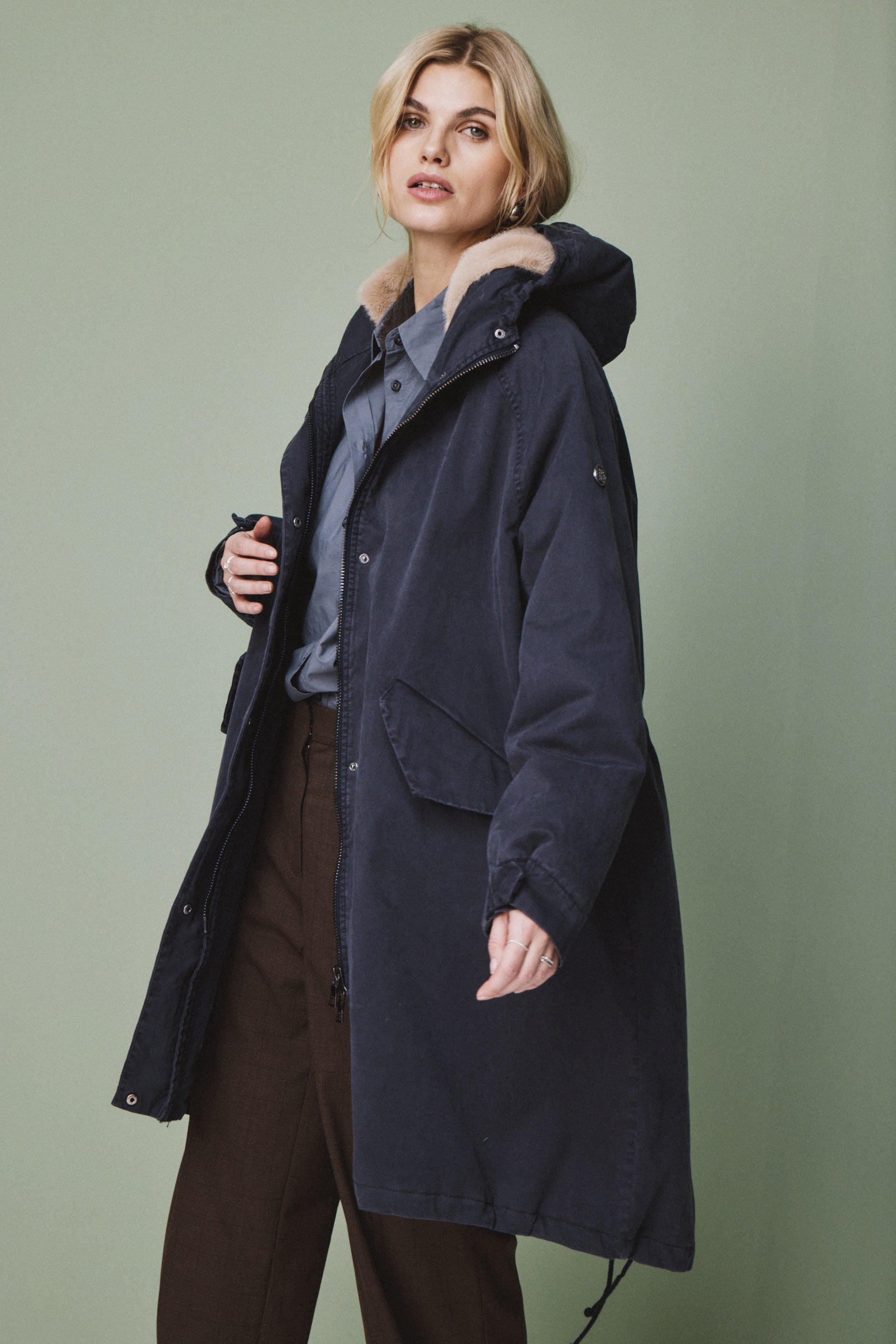 Die lange Form sorgt für zuverlässigen Schutz, während die verdeckte Knopfleiste mit Zwei-Wege-Reißverschluss für eine cleane Optik steht. Eine großzügig geschnittene Kapuze, die weich gefüttert ist, rundet den Look ab und schützt zusätzlich bei Wind und Wetter.
