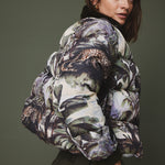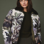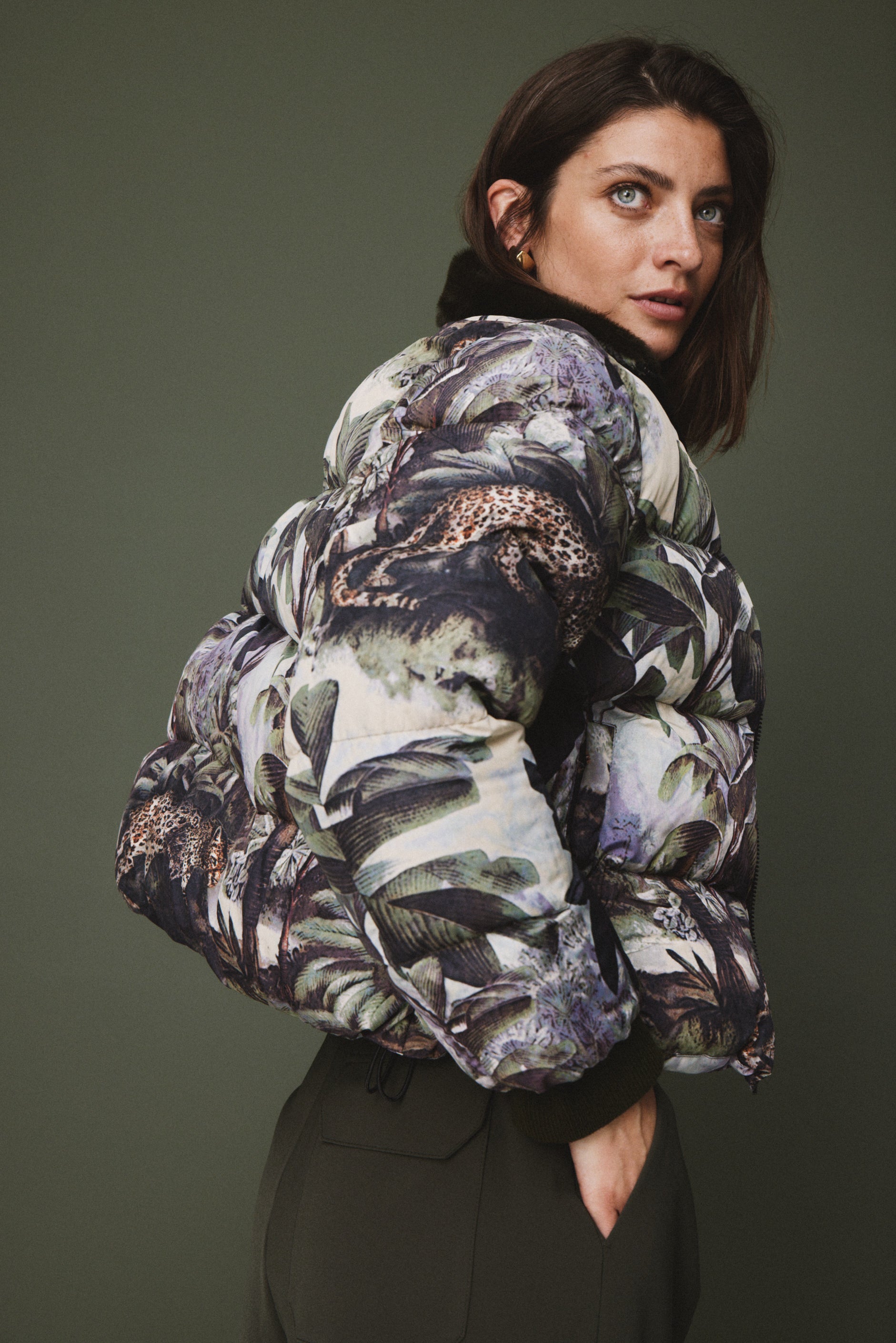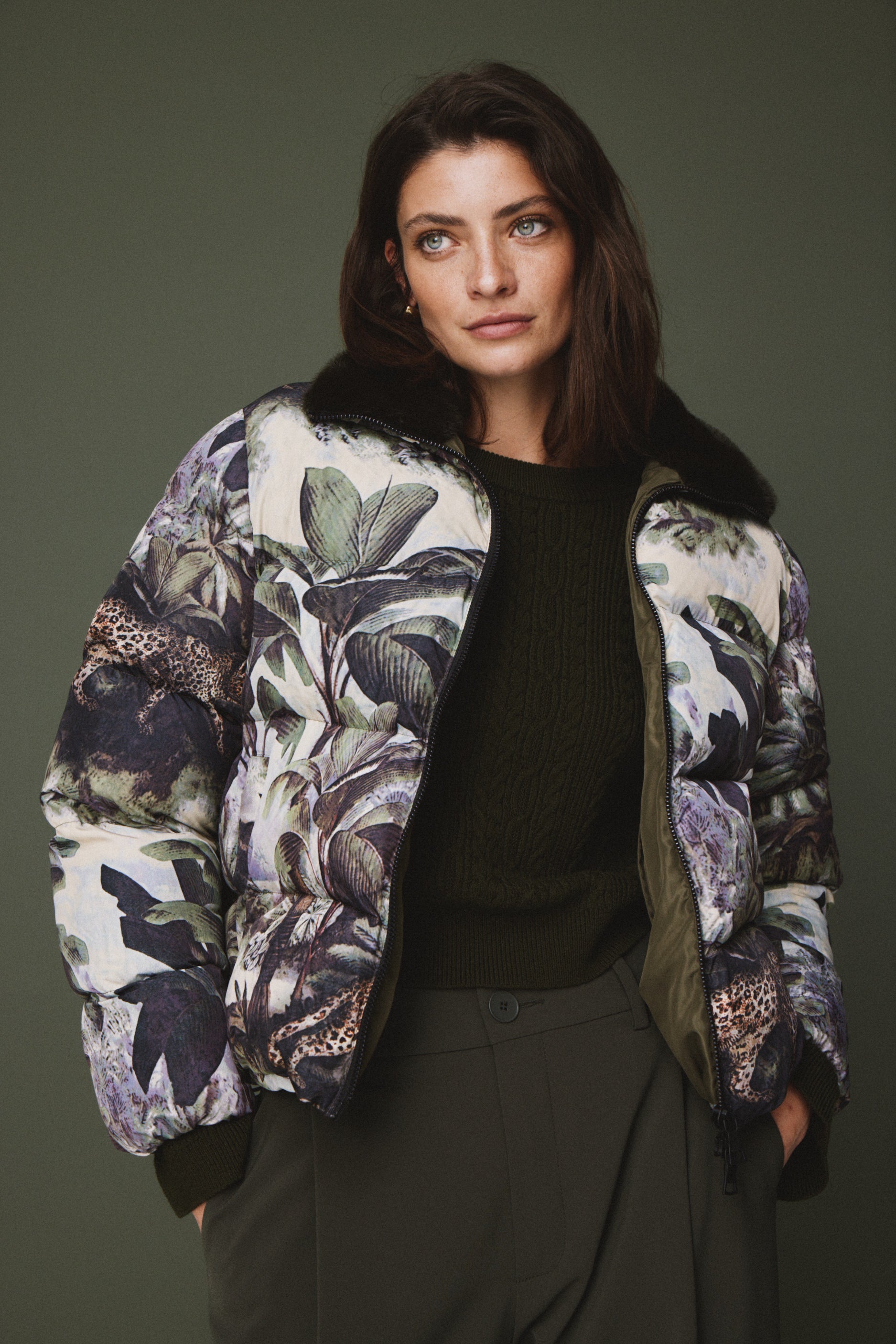 Der voluminöse Stehkragen mit Fake-Fur-Futter verleiht dem Design einen weichen, eleganten Rahmen und steht im spannenden Kontrast zum ausdrucksstarken Allover-Muster. Die kompakte Form und der gerade Reißverschluss sorgen für Struktur und Modernität.