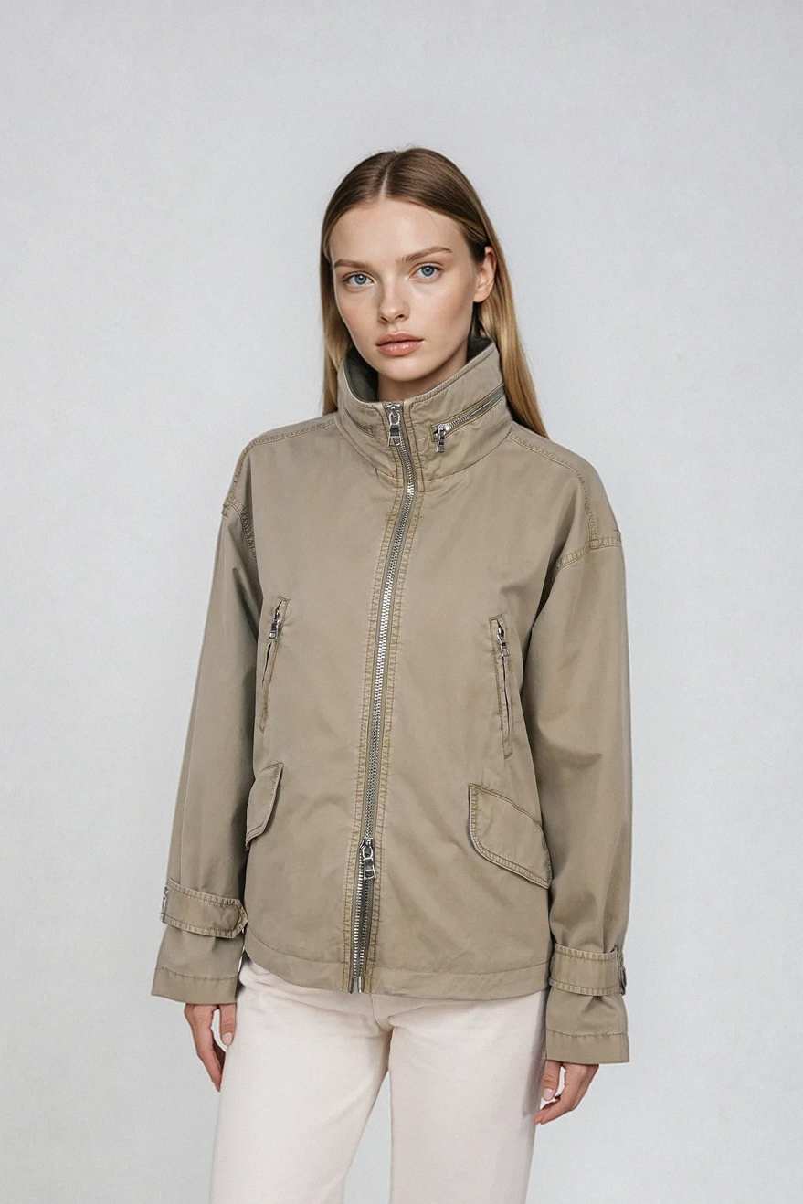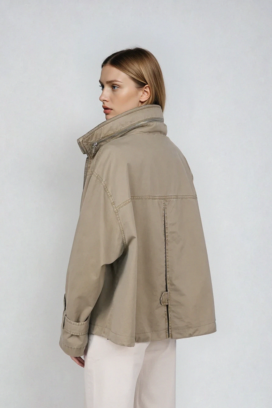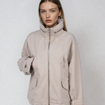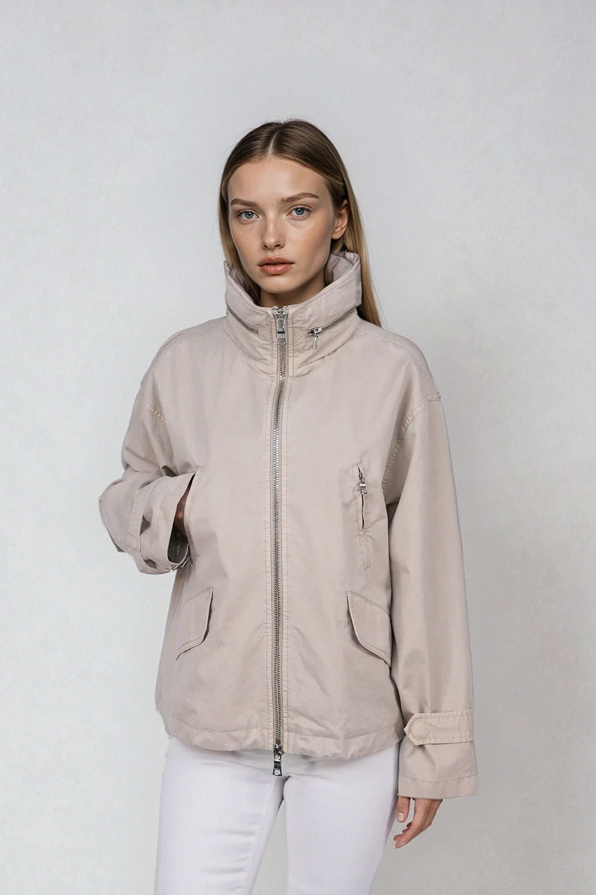 Die klare Silhouette wird durch funktionale Taschen und einen hohen Kragen mit integriertem Reißverschluss und verstaubarer Kapuze ergänzt. Dieses Detail bietet zusätzlichen Schutz bei wechselhaftem Wetter und unterstreicht den funktionalen, minimalistischen Charakter der Jacke. TIMRA ist vielseitig kombinierbar und eignet sich ideal für Übergangszeiten sowie milde Tage.