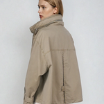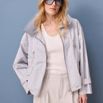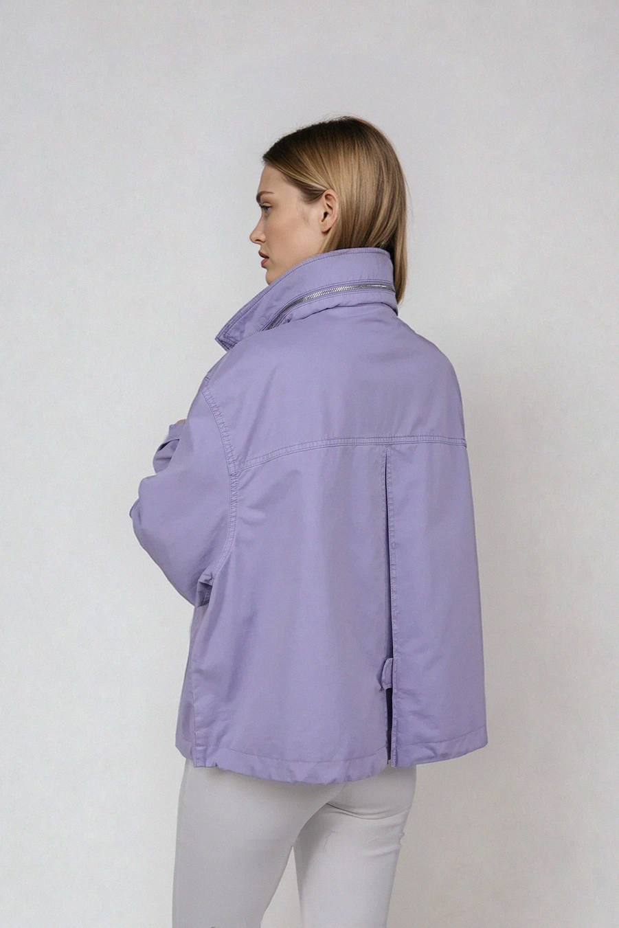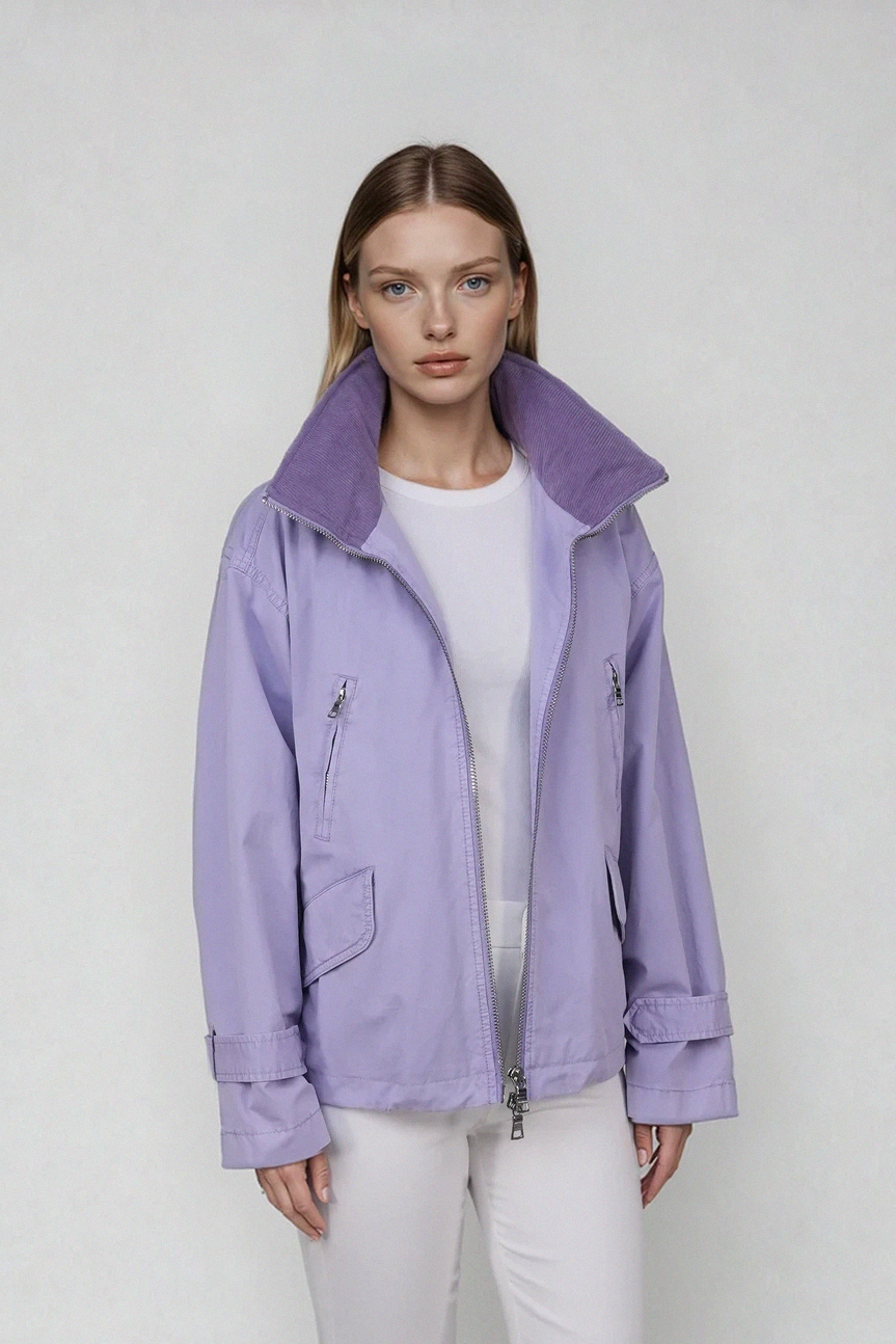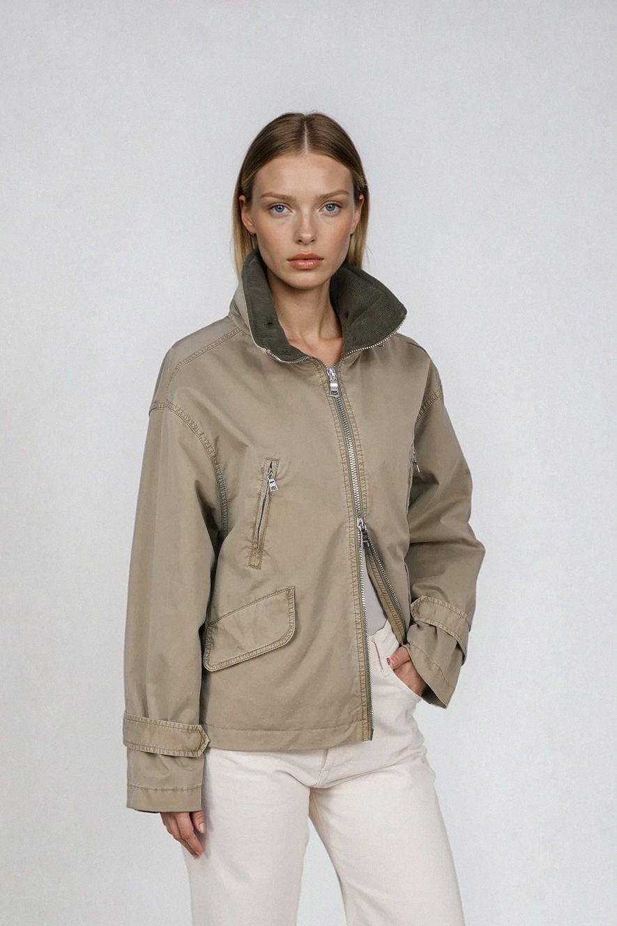 Die klare Silhouette wird durch funktionale Taschen und einen hohen Kragen mit integriertem Reißverschluss und verstaubarer Kapuze ergänzt. Dieses Detail bietet zusätzlichen Schutz bei wechselhaftem Wetter und unterstreicht den funktionalen, minimalistischen Charakter der Jacke. TIMRA ist vielseitig kombinierbar und eignet sich ideal für Übergangszeiten sowie milde Tage.